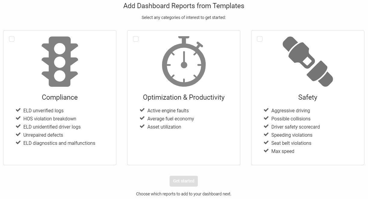 The application has a variety of options for the default home page. One of those options is the Dashboard: a graphical view of your preferred reports on one page. The Dashboard is intended to highlight critical events and behaviors throughout your entire fleet at a single glance. A number of reports are preselected to appear on your dashboard, but you can customize the visible reports to suit your needs.