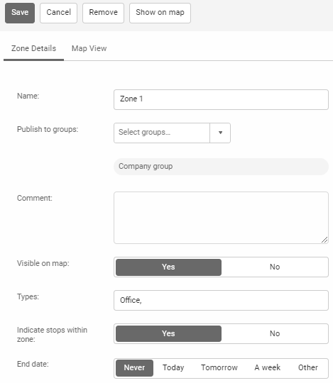 Roads | Dispatch vehicle here: Send a vehicle from your fleet to this location. Update posted road speed: Edit the road speed for a specific road. Add square zone here: Create a zone at this location. The zone will be an editable square centered on your selection. You can then name the zone and change its size and shape. Find address: Display the street address of your selection. If no street address is available, the application uses latitude and longitude. Area Activity: Explore what activity occurred in a selected area during a specific period of time by entering a date and time range. The application opens the Trips History page, where you can see which assets were active in the area and any trips that occurred during that time. |