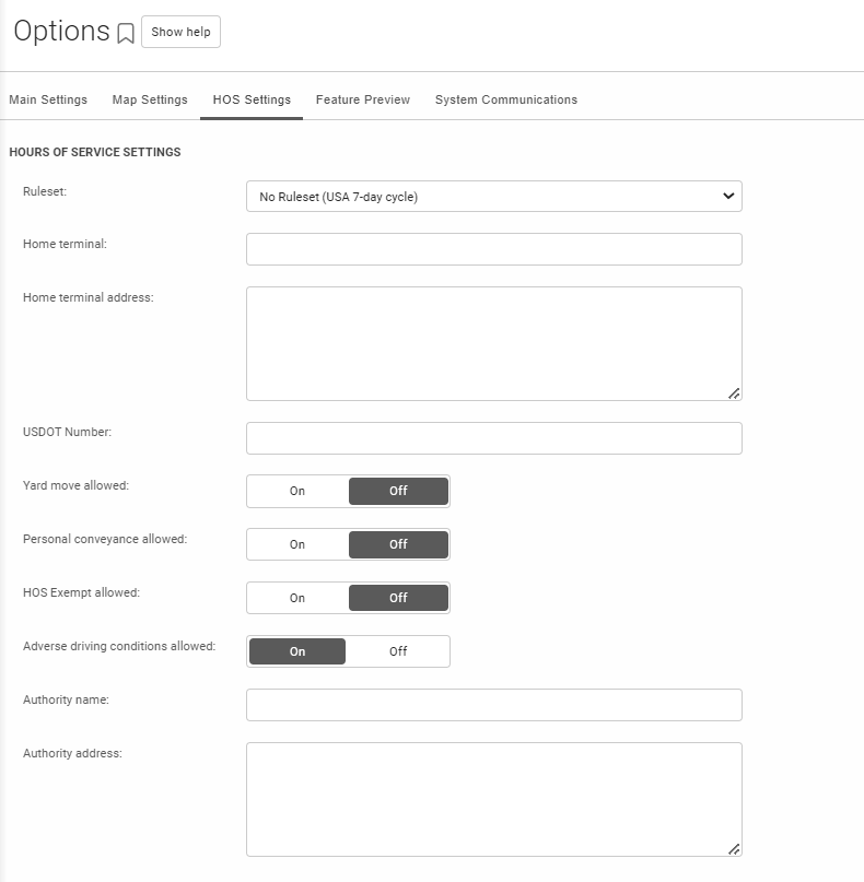 This menu allows you to set the appropriate settings for your fleet’s Hours of Service (HOS). Your selections here determine the ruleset applied to your fleet, your home terminal, terminal address, and allowances for your drivers.