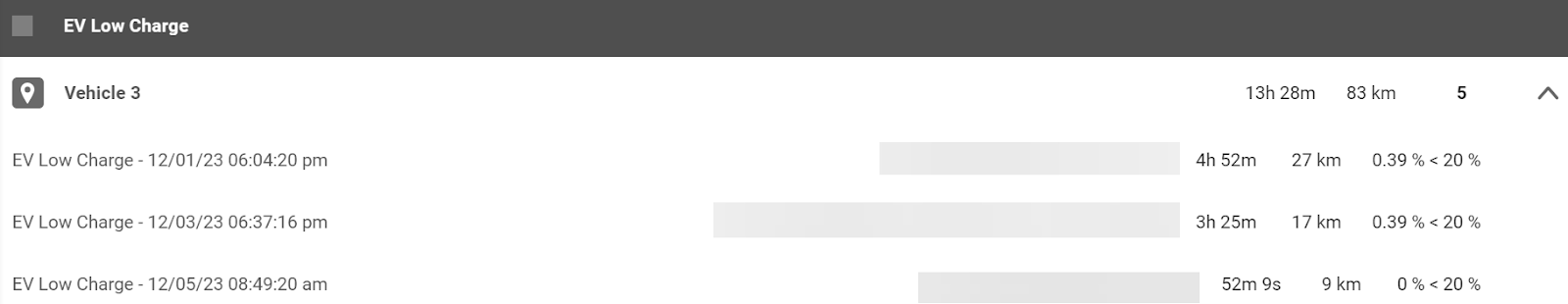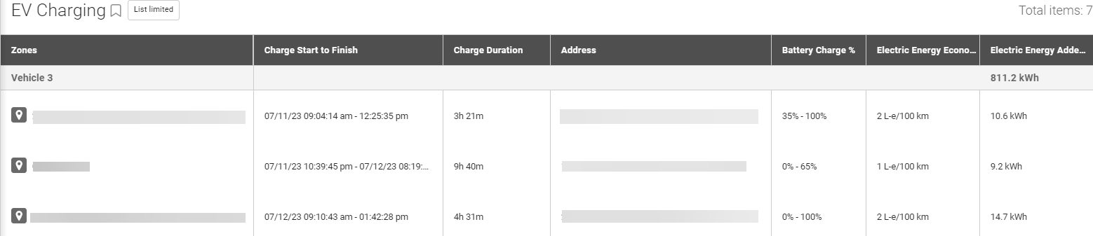 Fleets with electric vehicles can monitor EV charging activity directly on the Map. A vehicle’s current level of charge is indicated next to the vehicle name. Electric vehicles that are currently charging are marked with a lightning bolt icon.