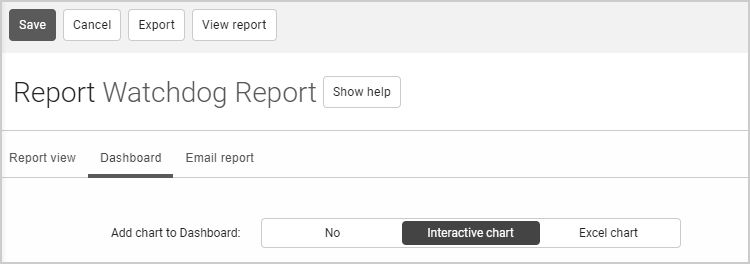 The Interactive charts allow you to view and change the data on your dashboard. Default settings are automatically added to the charts, so reports are ready to use on the dashboard when enabled.