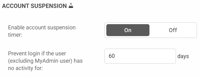 The Account Suspension option prevents a user from logging in if they have been inactive for a set number of days. Like the Password Expiry toggle, this option must be toggled On to allow the Administrator to set the required number of days, and is toggled Off by default.