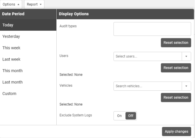 Use the Options menu to select the types of audit logs you wish to view from the dropdown menu, and your desired date range. You can also select individual users from the Users dropdown menu, and exclude System Logs in audit reports to make it easier to find and track changes made by users. Select Apply changes to view your results.