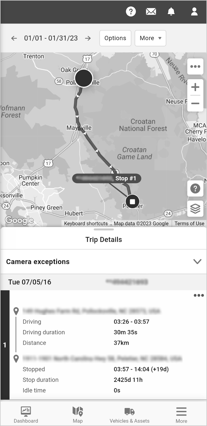 To view more information about an asset, select it from the asset list or search for it using the Find asset search box. You can view groups to which the asset belongs, asset name, asset location, latitude and longitude, asset status and date and time of the last status change, charge level and status for EVs, speed, driver name, driver contact information, zone name (if the asset is within a zone), and ongoing exceptions. You can also use the Status filter to view assets on the Map that are Driving, Stopped, or Not communicating.