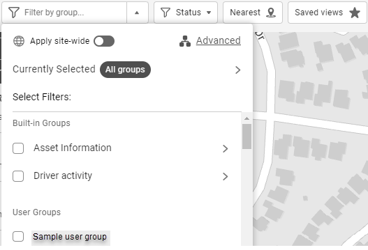 When viewing the Map or other components of your fleet, you can choose to view only certain groups of assets at a time. On the Map page, use the Filter by group… dropdown menu to select which assets are shown. The Advanced option allows you to create conditions to filter using more than one Operator type when searching for a specific group.